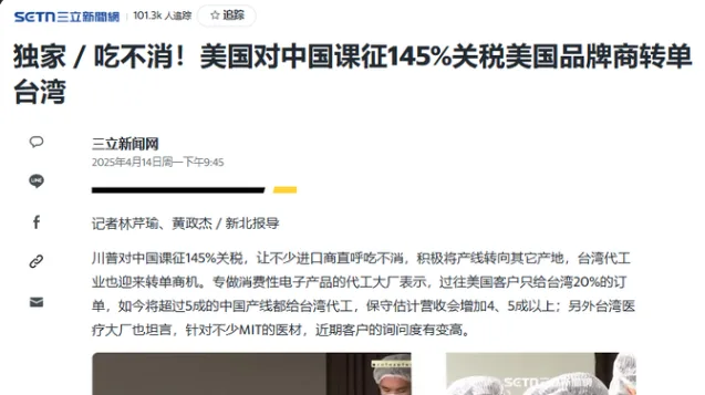 唐人日报4月17日讯:据台媒报道,随着特朗普政府对中国实施高达145%的惩罚性关税,不少美国品牌被迫将生产线迁出中国,台湾代工厂趁势承接大量转单,迎来新一轮增长机遇。