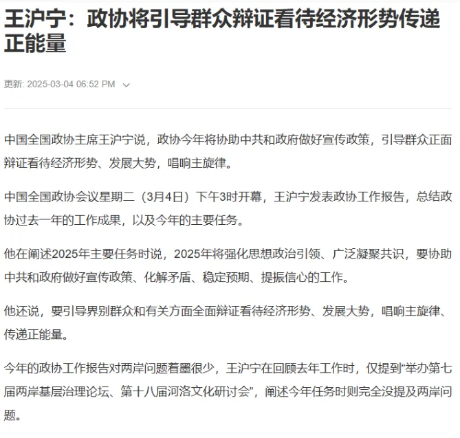 唐人日报3月6日讯:近日,王沪宁在政协工作报告中强调,今年政协将积极协助中共和政府在宣传政策方面发挥核心作用。他指出,政协需引导群众正面辩证地看待当前的经济形势和发展大势,以唱响主旋律和传递正能量为重点。