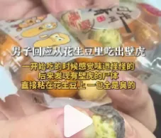 当事人吴先生回忆称,自己打开包装袋后吃了几颗,感觉味道“怪怪的”,带有一股腥臭味。“我仔细一看,竟发现一只壁虎的尸体粘在花生豆上,袋子里面还散发着恶臭。”吴先生说,当下他整个人都愣住了,立刻反胃,之后几天都不敢再吃任何零食。