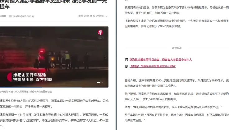 唐人日报11月14日讯:近日,网传珠海撞人事件涉事车辆为北汽旗下的 BJ40 先锋版越野车。司机在案发一周前购买,并于 11 月 10 日即案发前一天才提车。 记者走访北汽销售厅,一名黄姓销售证实一名樊姓男子近期刚购买这辆车。 他还提到,涉案男子购车时表现正常,和其他顾客无异,通过贷款方式购买这越野车。