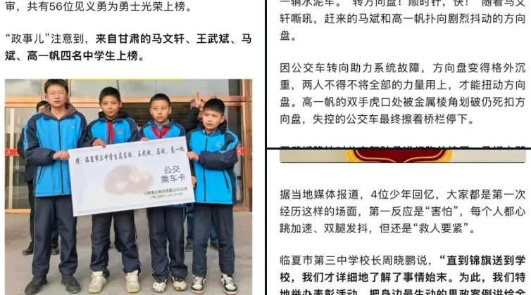 唐人日报4月3日讯:据报道,甘肃临夏发生一起险象环生的公交突发事件,四名初中生在上学途中临危不惧、机智救人,成功避免了一场可能的交通惨剧。