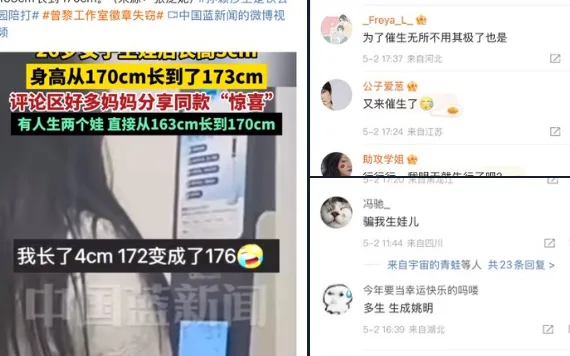 不少网友表示质疑:“又开始用奇迹催生了?”“163长到170有点夸张了吧。”还有人讽刺道:“那生三胎是不是能变成姚明?”质疑声音不断,认为这种说法缺乏科学依据,容易误导公众。