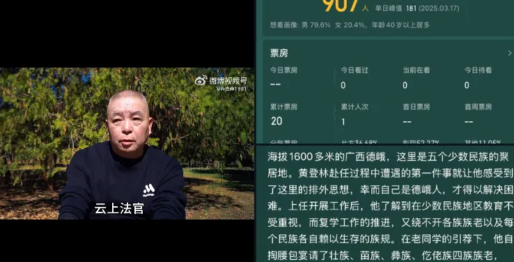 唐人日报3月26日讯:近日,一部投资上亿的电影《云上法官》自3月6日上映以来,其票房表现极为不佳。根据猫眼票房数据显示,该片至今累计票房仅为20元,观影人次仅1人,成为业内罕见的票房灾难。
