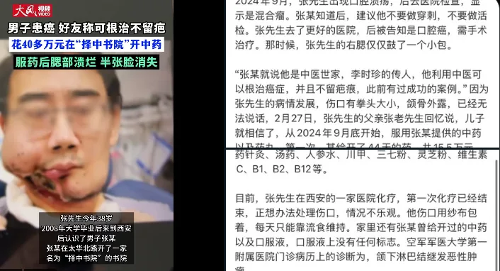 唐人日报3月1日讯:去年张先生被诊断为口腔癌,建议手术治疗。然而,朋友张某建议他不做穿刺及活检,改为服用中药治疗。张先生花费15万元购买的中药未见效,张某继续推销并开出28万元的药方。到2023年11月,张先生的病情急剧恶化,腮部肿块破裂,伤口大如拳头,半张脸消失,无法正常说话。此时,张先生才发现自己被骗。