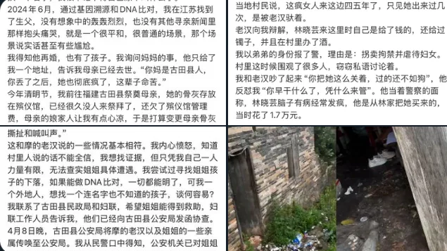 周明远从亲戚口中得知,自己还有一位同母异父的姐姐。4月5日,他赶到姐姐所在的福建古田县,却发现姐姐竟被长期囚禁在一个不足10平方米的土窑房内,窗户被钉死,屋内堆满垃圾、腐烂食物、烟头和排泄物,臭气熏天,几乎无处落脚。