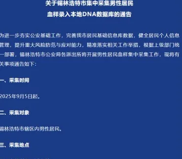 唐人日报9月25日讯:内蒙古自治区锡林浩特市公安局发布通告称,自9月5日起,当地警方已在辖区范围内集中采集男性居民血样,以录入本地DNA数据库。警方强调,此举是为进一步完善公民身份信息体系,确保与身份证、护照等证件办理及个人信息确认直接衔接。
