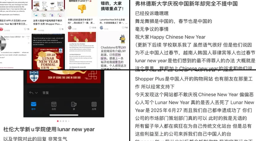 唐人日报1月29日讯:近日,一些中国留学生针对海外学校、网站、超市等在庆祝春节时使用“Lunar New Year”而提出投诉,指责这一用词涉嫌文化歧视和挪用。尤其在英国杜伦大学,一名留学生组织了上百名支持者,联名控诉学校使用“Lunar New Year”庆祝春节。