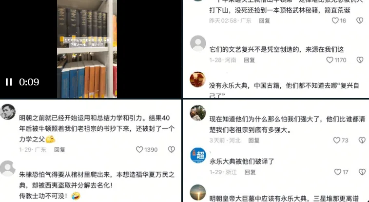 唐人日报2月9日讯:近日,一名中国留学生在英国图书馆发现多本记载中国古代技术和文化的书籍,引发网友热议。一些网友指责西方剽窃中国技术,认为中国古代智慧为西方的科学进步做出了巨大贡献。更有言论指出,没有《永乐大典》中的知识积累,就没有西方的文艺复兴、万有引力和蒸汽机等重要发现。