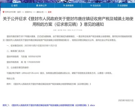 唐人日报10月24日讯:河南登封市政府官网发布《登封市人民政府关于登封市唐庄镇征收房产税及城镇土地使用税的方案(征求意见稿)》,计划在唐庄镇全域范围内试点征收房产税及城镇土地使用税。该消息一经公布,立即引发社会强烈关注与舆论争议。