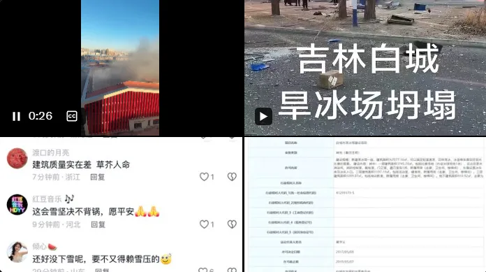热门头条 白城滑冰馆屋顶坍塌 应急管理局已介入 0 唐人日报11月20日讯:近日吉林白城滑冰馆屋顶突发坍塌,现场浓烟滚滚。该馆投入使用不足7年,坍塌原因及伤亡情况尚不明确,白城应急管理局已介入调查。Continue ReadingPrevious 扬州5岁男童遭装载机碾亡 涉事司机已被控Next 1死4伤!芝加哥失窃车辆发生车祸,警方调查 延伸阅读 热门头条 密密麻麻!福建一查扣点堆满电动车 网友:这得罚了多少人 0 热门头条 马路中间举锦旗“致谢”!上海美团骑手街头控诉报酬被克扣 0 热门头条 退市多年负债超两百亿,乐视网突然宣告要拿1.8亿元炒股 网友:为何不还债? 0 热门头条 陕西未完工自建房遭强拆 村民哭诉无家可归 0 热门头条 广东潮州沙溪镇突发工厂大火:火势迅猛冲天,黑烟压顶! 0 热门头条 像货车司机一样强制休!外卖新国标引热议 骑手怕收入缩水 0 发表回复 取消回复您的邮箱地址不会被公开。 必填项已用 * 标注评论 *显示名称 * 邮箱 * 网站 在此浏览器中保存我的显示名称、邮箱地址和网站地址,以便下次评论时使用。
