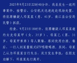 唐人日报9月29日讯:四川巴中市官方发布通报,一起震惊社会的刑事案件引发广泛关注。通报称,9月23日晚,巴中市南江县发生恶性命案,嫌疑人邓某某(男,41岁,南江县公安局民警)酒后与女友家人发生争执,竟持刀行凶,导致女友的母亲和弟弟当场死亡,女友本人受伤。事发后,邓某某被迅速控制并刑事拘留,目前案件已由巴中市公安局提级侦办。