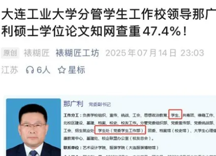 唐人日报7月18日讯:有网友爆料,大连工业大学一位分管学生工作的校领导,其硕士学位论文在中国知网查重系统中检测出高达47.4%的重复率,涉嫌严重学术不端,引发舆论哗然。
