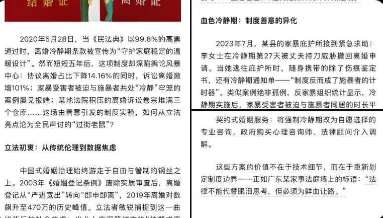 此外,一些极端情况下,如家庭暴力受害者需等待冷静期过后才能获得法律解脱,这种情形更是激起了公众的强烈反响。社会各界呼吁,法律应更多地考虑到保护弱势群体的需要,而不是一味地通过行政手段来约束人们的个人选择。