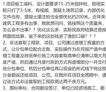 举报中还提到,公司在内部以“优化”名义,将混凝土灌注桩普遍缩短近200米,但结算时仍按原设计标准向政府或业主报账。举报人质疑:“省下的那笔钱去哪了?是谁在中间获利?”