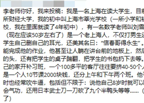 有学生家长指出,刘雪春不仅在校内滥用体罚,还在家中违规私设高价补习班,以权谋私,收费高达数千元,暗示“谁来补课就不为难谁”。此外,该教师多次当众吹嘘所谓“神奇经历”,包括“8岁活吞癞蛤蟆”“掌握气功”等,行为荒谬,令人质疑其心理状态与师德水平。