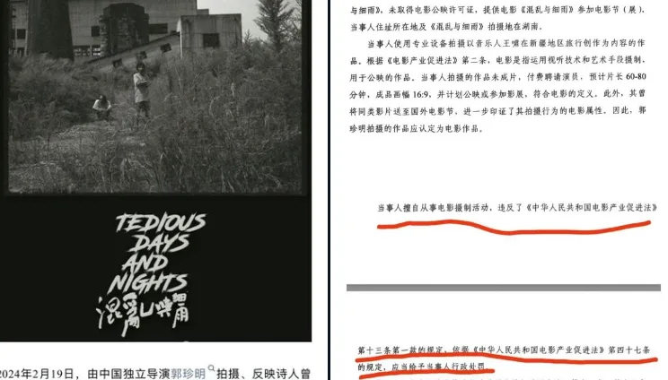 纪录片《混乱和细雨》由郭珍明执导,内容聚焦诗人曾德旷的底层生活,此前已在多个国内外电影节展映,受到文艺界好评。然而,该片似因拍摄流程未严格履行相关行政审批程序,或涉及题材敏感,被有关部门认定存在违规行为。
