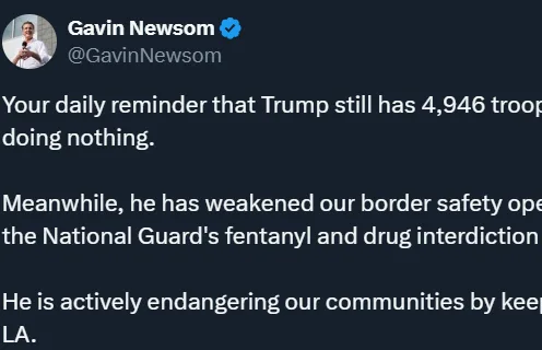 “每日提醒你,特朗普仍将4946名士兵留在洛杉矶,无所事事,”纽森写道,“与此同时,他削弱了我们的边境安全行动——将国民警卫队在芬太尼和毒品拦截任务上的兵力削减了32%。”