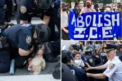 唐人日报6月11日讯:纽约市下城爆发大规模反ICE抗议活动,数千名愤怒民众聚集在弗利广场,抗议联邦移民局在全美范围内展开的驱逐行动。抗议者高举“废除ICE”“ICE滚出纽约”等标语,高喊“这个种族主义制度必须倒下”的口号,现场气氛紧张。