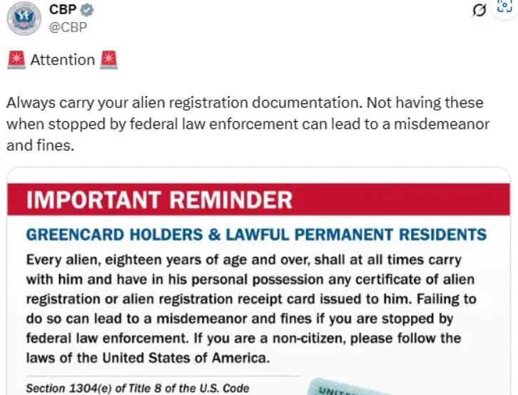 唐人日报7月25日讯:美国海关与边境保护局(CBP)于近日在其官方社交平台X发布公告,罕见地重申一项长期存在但少被广泛执行的联邦法律:所有合法居留的非美国公民,特别是绿卡持有者,必须在日常生活中随身携带移民身份证明文件。公告指出,违反该义务者将可能面临轻罪指控及联邦罚款。