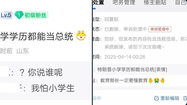 唐人日报4月17日讯:一则看似无害的网络评论在国内某贴吧引发热议。一名网友在讨论区发帖调侃称:“特朗普小学学历都能当总统。”随后有网友跟帖追问:“你说谁呢?”然而不久后,该评论便被系统删除,原帖也迅速无法查看。