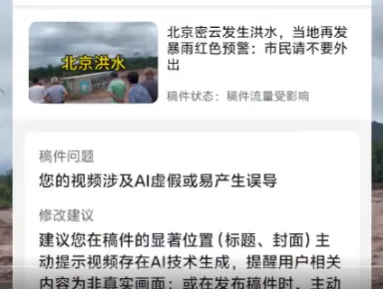 密云洪灾本已牵动民众神经,而此次事件进一步放大了社会对信息公开与灾害报道自由的敏感情绪。人们担忧,在重大自然灾害面前,如果真实影像被轻易以“AI嫌疑”封禁,可能导致公众无法及时获得第一手信息,甚至影响救援和防灾判断。