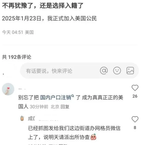 唐人日报2月4日讯:近日,一名网友在小红书分享自己正式入籍美国的经历,引发了热议。在评论区,一些网友提醒他不要忘记注销中国户口,以免影响个人身份和法律地位。而更有网友将这一内容截图后,向当地街道办网格员举报,称将协同派出所展开调查。此事件引发了公众对双重国籍和户籍问题的关注。