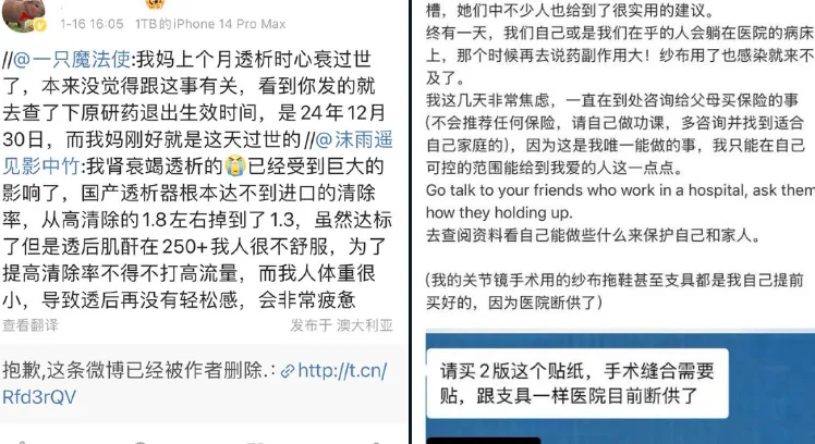 另一名网友则分享了个人悲痛经历,称其母亲在透析过程中因心衰去世。网友表示,起初未将此事件与医保集采政策联系,但查询后发现,原研药的退出生效时间恰为2024年12月30日,而其母亲正是在当天去世。此事引发了对医保集采政策及国产医疗设备质量的广泛关注。