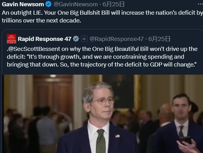 纽森驳斥财政部长斯科特·贝森特(Scott Bessent)此前关于赤字“通过增长解决”的说法,称这只是为掩盖实质财政漏洞而制造的“增长神话”。贝森特在回应质疑时表示:“赤字是通过增长来实现的,而我们正在限制支出,降低赤字。因此,赤字占GDP的比例将会改变。”