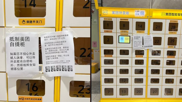 唐人日报2月19日讯:近日,杭州富阳银湖科技园的美团外卖柜上,出现了“抵制美团自提柜”的宣传单。根据报道,近期美团开始向外卖骑手收取自提柜费用。宣传单中指出,美团在2024年第三季度的净利润已达到129亿元,这些利润足以补贴自提柜业务,骑手不应为此买单。