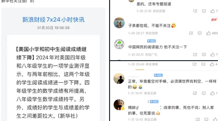 唐人日报1月31日讯:近日,2024年美国四年级和八年级学生的学业测评显示,这两个年级的学生阅读成绩较两年前有所下降。这一结果引发广泛关注,同时也在网络上引发嘲讽和热议。部分网友讽刺称:“自家的事,死也不说;别人家的事,往死里说。”还有人调侃:“好像美国街道爆水都上新闻联播了。”