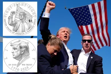 从曝光的设计稿来看,纪念币正面印有唐纳德·特朗普总统的侧面头像,辅以“IN GOD WE TRUST(我们信仰上帝)”及“1776–2026”的字样。背面则刻画了特朗普在2024年暗杀未遂事件后举拳致意的经典姿势,下方写有“FIGHT FIGHT”字样,象征其“顽强不屈的精神”。财政部官员表示,这一设计旨在“庆祝国家韧性与团结”,但外界普遍认为其政治意味浓厚。