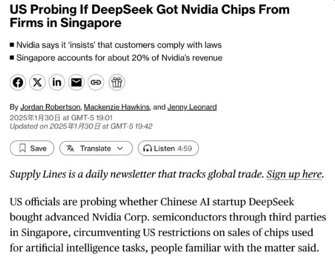 唐人日报1月31日讯:近日,美国政府正在调查DeepSeek是否通过新加坡公司绕过美国出口管制,获取英伟达的先进半导体。据彭博社报道,知情人士透露,白宫和FBI正在调查DeepSeek是否利用东南亚中介购买美国禁止对华出口的英伟达芯片。