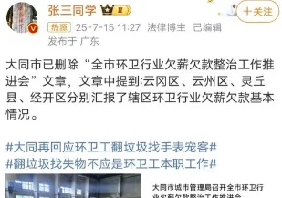 唐人日报7月18日讯:近日,大同环卫工人为寻找一名儿童丢失的手表,4小时内翻找8吨垃圾的事迹感动无数网友,网友纷纷点赞“城市最美背影”。然而,就在舆论高度聚焦环卫群体时,有细心网友发现,大同市城管局于6月30日在其官方微信公众号发布的一篇《全市环卫行业欠薪欠款整治工作推进会》文章,已悄然被删除。