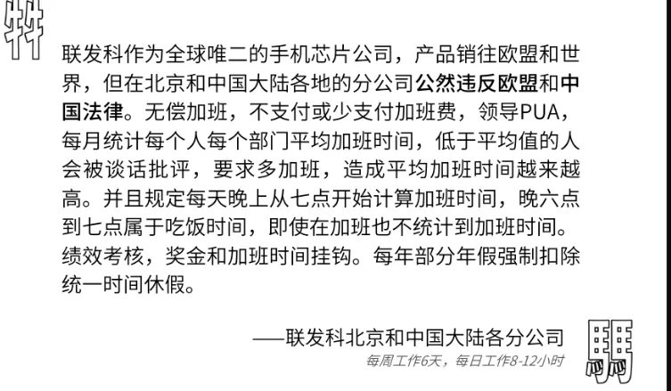 唐人日报3月22日讯:近日,联发科中国分公司员工向外界反映了公司存在的一些劳动管理问题,称公司在北京及其他地区的分公司存在违反欧盟和中国劳动法的情况,尤其是在加班和绩效考核方面。