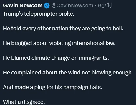 纽森在X(原推特)上写道:“特朗普的提词器坏了。他告诉所有其他国家,他们都要下地狱。他吹嘘自己违反了国际法。他把气候变化归咎于移民。他抱怨风力不够。还为他的竞选帽子做广告。真是丢脸。”