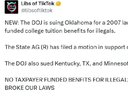 该法律规定,只要非法移民在俄克拉荷马州完成高中教育,或在州内连续居住一定年限,即可获得本州居民学费资格。相比外州学生,他们的学费差额高达数千美元,全部由州纳税人埋单。司法部在诉状中指出,这不仅是在用公共资金奖励非法入境,还对守法公民和合法移民造成直接的不公平。
