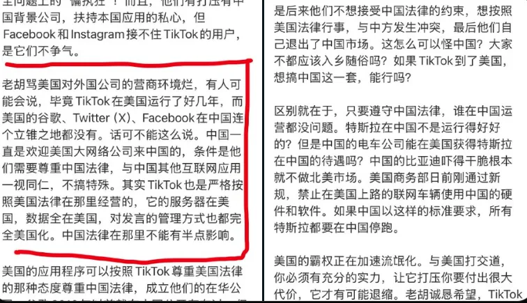 唐人日报1月19日讯:近日,胡锡进发文评论TikTok遭遇,称这一事件反映了美国营商环境对外国投资者的严峻态度。他指出,尽管美国的谷歌、推特和脸书等公司在中国无法立足,但中国始终欢迎美国网络公司,只要求其遵守中国法律。