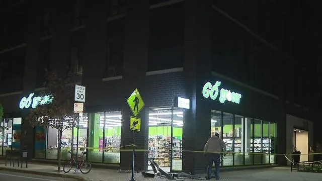 周一清晨,位于521 W. Diversey Parkway的Go Grocer超市成为最新受害者,门框被破坏,门前用木板封住。