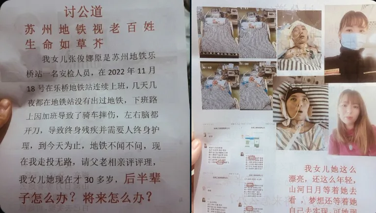 唐人日报1月31日讯:近日,苏州地铁乐桥站一名安检员的家属通过撒传单维权,传单称该女子张俊娜因长期加班,连续几天未离开地铁站,在下班途中骑车摔伤,导致脑部受伤并终身残疾。