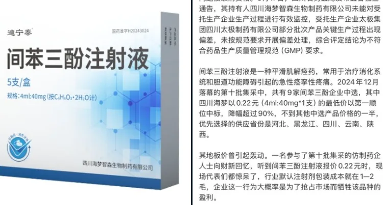 唐人日报3月19日讯:近日,第十批国家药品集中采购中,一家药企因其间苯三酚注射液存在质量问题,被取消中选资格。间苯三酚注射液是一种广泛用于治疗消化系统和胆道功能障碍引起的急性痉挛性疼痛的药物。距离集采结果执行不足一个月,该事件已引起业界和公众的广泛关注。
