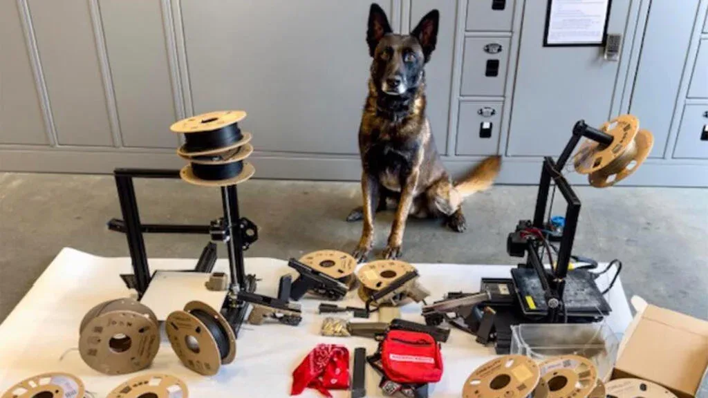 随后,特遣队进入希门尼斯家中进行全面搜查。现场查获三支已上膛的9毫米“幽灵枪”、两台3D打印机、大量枪支零件及成箱弹药。一只警犬也参与了搜查,协助发现藏匿在家具后的零件与工具。警方认为,这些设备足以生产完整的武器系统,具备“微型地下枪厂”的雏形。