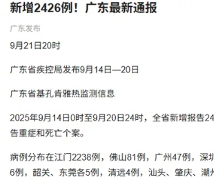 唐人日报9月25日讯:广东省最新通报显示,自9月14日零时至9月20日24时,全省新增报告本地基孔肯雅热确诊病例2426例。这一数字的公布,再次敲响了登革热类蚊媒传染病在南方地区扩散的警钟,也让公众对疫情防控的严峻形势深感担忧。