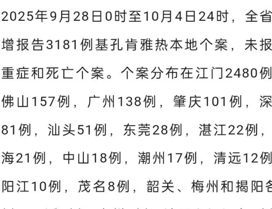 唐人日报10月13日讯:广东省疾控局10月5日发布最新通告称,2025年9月28日0时至10月4日24时,全省新增报告本地基孔肯雅热病例3181例。虽然暂未出现重症或死亡个案,但病例数量持续攀升,疫情防控压力骤然加大。