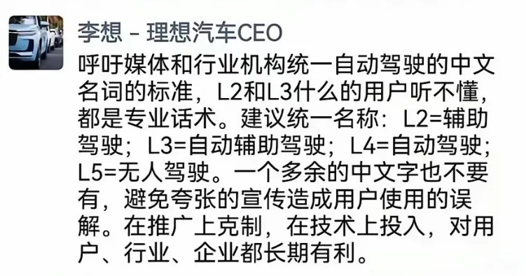 唐人日报4月3日讯:近日,理想汽车CEO李想在朋友圈公开发声,呼吁媒体与行业机构统一自动驾驶相关中文术语标准,避免技术名词混淆概念、误导消费者。他直言,当前L2、L3级别的“自动驾驶”标签对普通用户而言根本听不懂,完全是“专业话术”。
