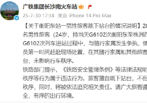 广铁集团表示,事件未造成列车晚点,站台秩序很快恢复正常。铁路部门提醒旅客,候车期间应保持冷静理性,任何在站台或轨道区域的危险行为,不仅威胁自身生命安全,也可能影响列车运行和公共安全。