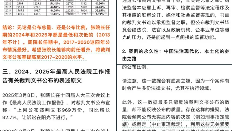 金印博士的分析显示,周院长任期内(2017年-2020年),裁判文书的公开情况相对最佳。相较之下,张院长在十四届人大二次会议和三次会议上的数据报告显示出惊人的增长:2024年宣称裁判文书上网数量增长至216.5万件,同比增长111.6%;2025年更是达到969万份,同比增长92.7%。尤其是最高人民法院和高级人民法院的文书上网数量同比增长了4.7倍。