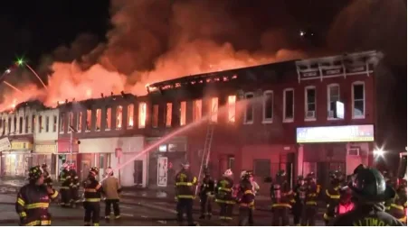 唐人日报3月8日讯:近日,美国巴尔的摩市西部发生了一起严重的排屋火灾,巴尔的摩市消防部门迅速响应,努力控制火势。这起火灾发生在凌晨4点26分,位于北富尔顿街2200街区的多栋联排住宅被大火吞噬,火灾的迅速蔓延造成了极大的破坏。