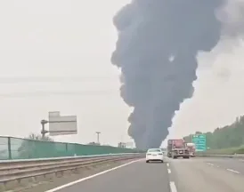 唐人日报10月20日讯:长深高速公路上突发严重交通事故,一辆载有易燃物的油罐车在行驶途中突然侧翻并起火,瞬间被火焰吞没,现场浓烟滚滚,黑色烟柱直冲云霄,远处数公里外都能清晰看到。事故发生后,路面交通紧急封闭,消防、交警及应急救援力量迅速赶赴现场处置。