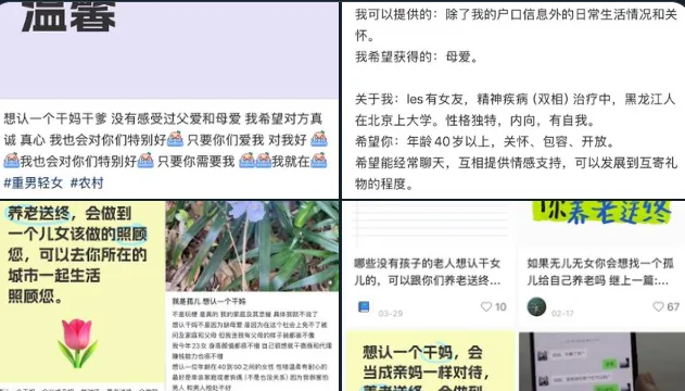 在高房价、职场焦虑、异地漂泊等多重压力下,许多年轻人渴望获得情感支持与现实援助。有的是孤儿,从未体会过父母的关爱;有的成长于破碎家庭,缺乏温暖;也有人坦言,“找个有经济能力的干妈,至少不用承担房租水电。”