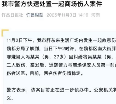 唐人日报11月6日讯:河南许昌魏都区南大街胖东来生活广场内发生一起令人震惊的持械伤人事件。警方通报显示,犯罪嫌疑人冯某某(男,37岁)因个人纠纷,在商场一楼大厅入门处持凶器袭击吴某某(男,41岁)及其妻子徐某某(女,39岁),造成两人受伤。